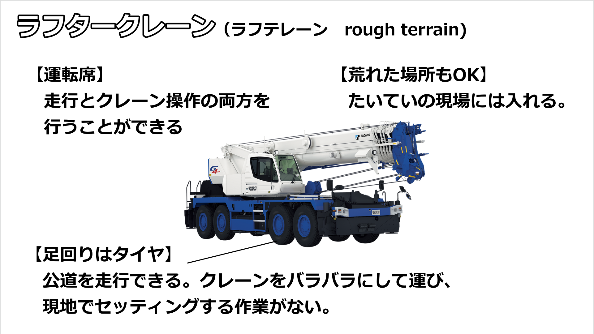 • 荒れた場所も走行できるので、たいていの現場には入っていけます。名前の「ラフテレーン(rough terrain)」とは、不整地を意味します。