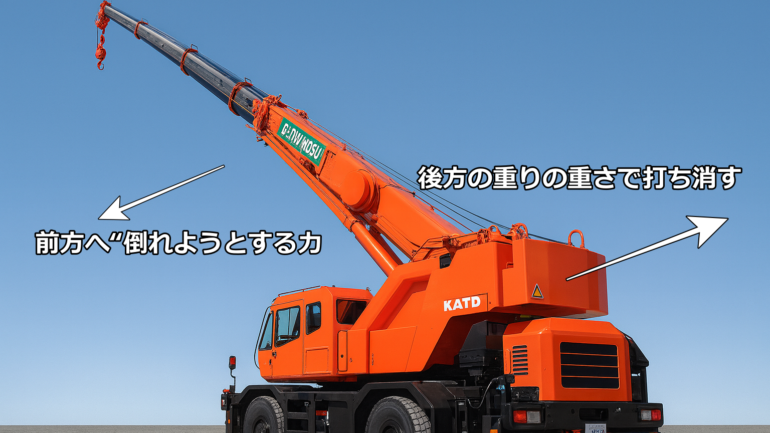 ブームを前に伸ばして荷物を吊ると、 前方へ“倒れようとする力”が働きます。それを後方の重りの重さで打ち消して、バランスを保つのです。