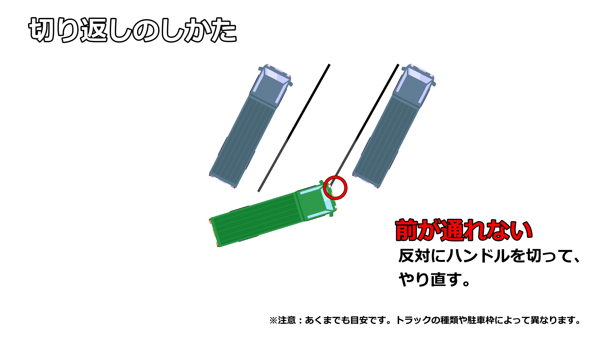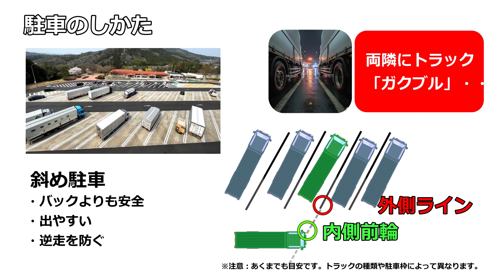 ちょっとの工夫で、隣のトラックが出やすくなる。お互いに気を遣い合えば、事故もトラブルも減るのです。