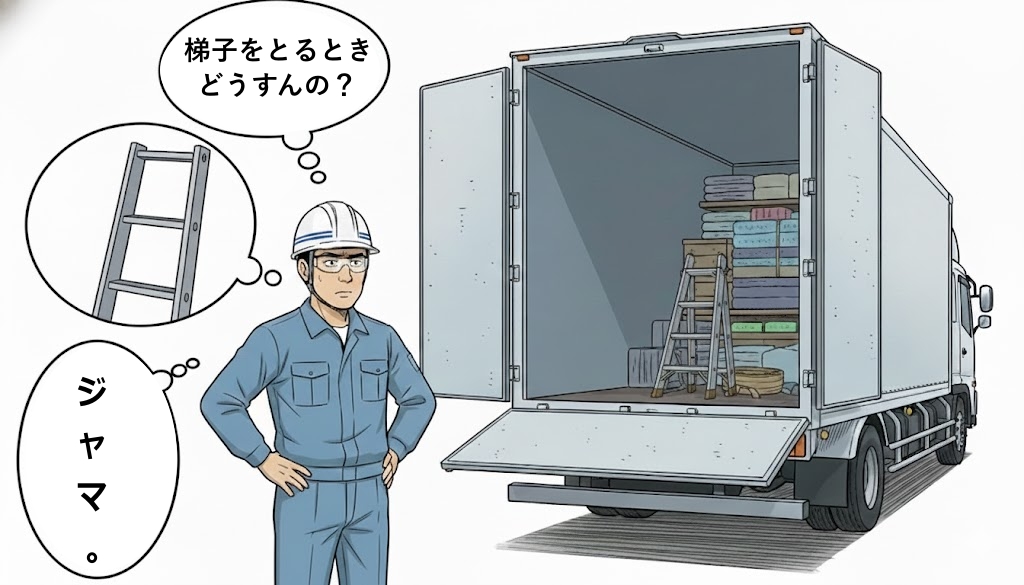 「荷台への昇降は梯子を使用」。そのためだけに梯子を積むドライバーも増えています。道具を最小限にしたい現場事情と、ルールの間でモヤモヤが残ります。