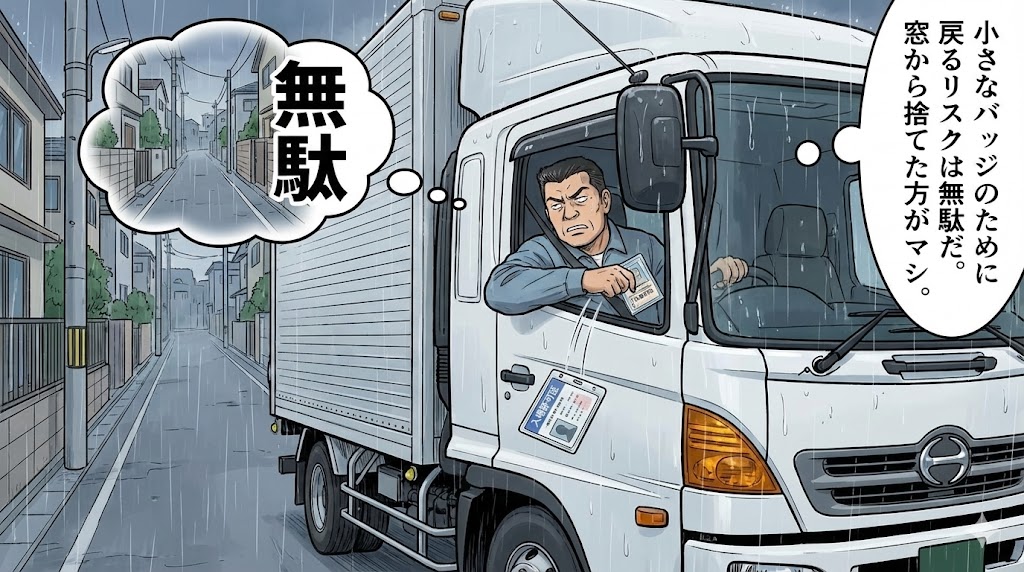 受付で渡される入場許可証やバッジ。返し忘れたときのために、再び住宅街を大型トラックで戻るリスクを考えると、安全第一とは思えません。