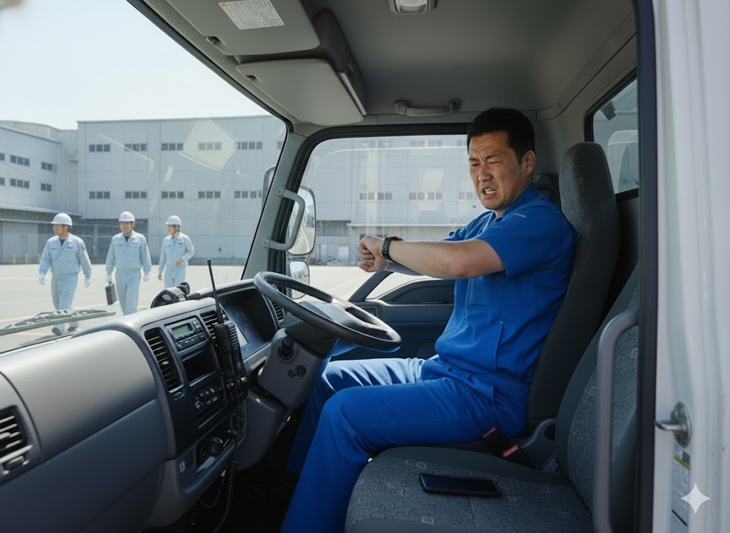通勤時間や昼休みは構内走行禁止。11時55分に作業が終わっても、13時まで動けない。従業員が昼食に向かう姿をただ眺めるだけの時間が、拘束時間だけを削っていきます。