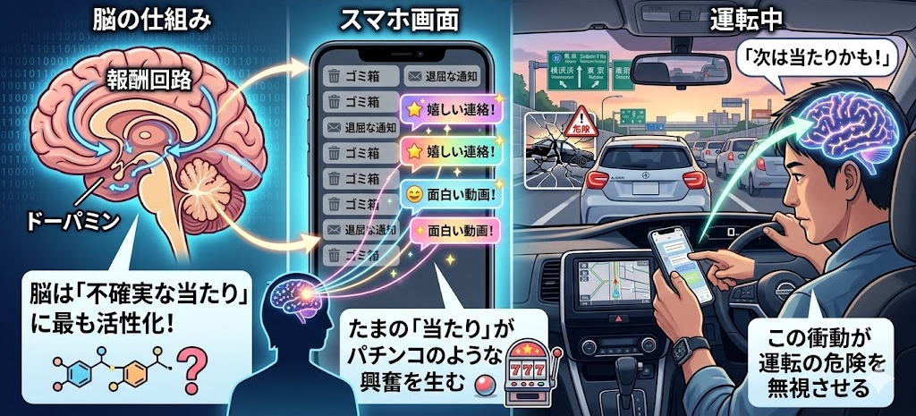 この「不確実な当たり」を求める衝動が、運転中という危険な状況でもスマホを触らせようとする強い力になっているのです。