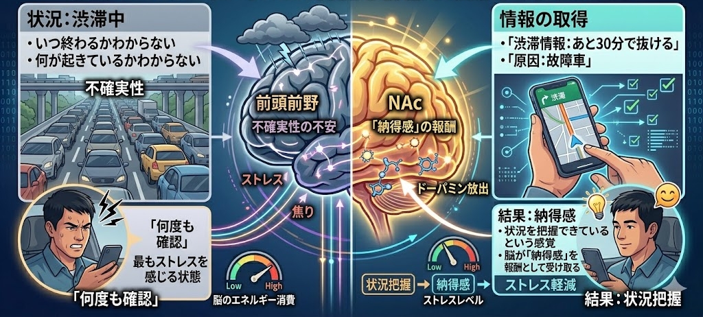「あと30分で渋滞を抜けられる」「原因は故障車」という情報を得ることで、たとえ渋滞が解消されなくても、「状況を把握できている」という感覚が生まれます。