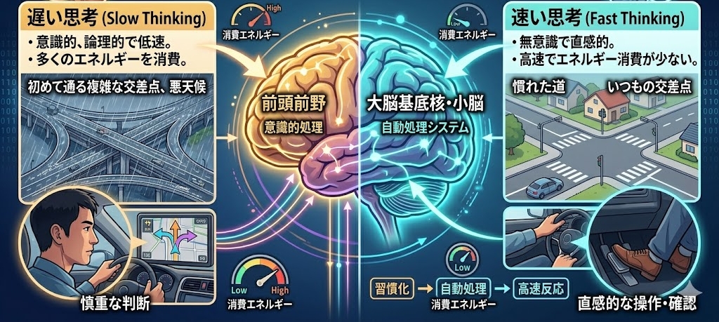 「遅い思考」は 意識的、論理的で低速。多くのエネルギーを消費するのが特徴です。初めて通る複雑な交差点や、悪天候での慎重な判断がこれにあたります。