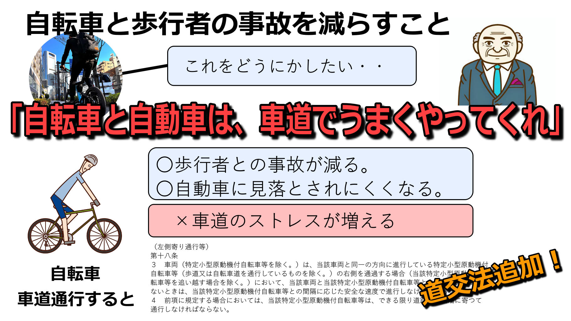 そして、「自転車は歩道を走っちゃダメなんだ」ということで、車道を走る自転車が増えています。