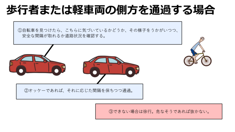 「歩行者または軽車両(自転車)の側方(そくほう)を通過する場合は、次の間隔を保つ」。(原文のままではありません。ちょっと変えています。)