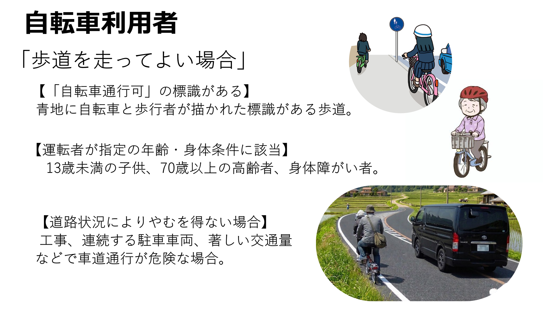 自転車は、①標識があるとき ②子供やお年寄り ③車道走行が危険なとき