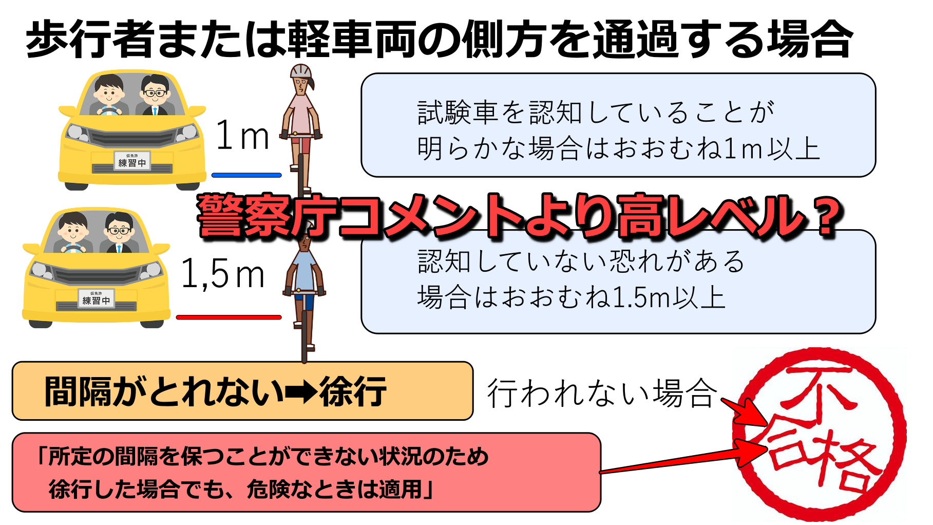 • 「歩行者又は軽車両が試験車を認知していることが明らかな場合はおおむね1m以上」